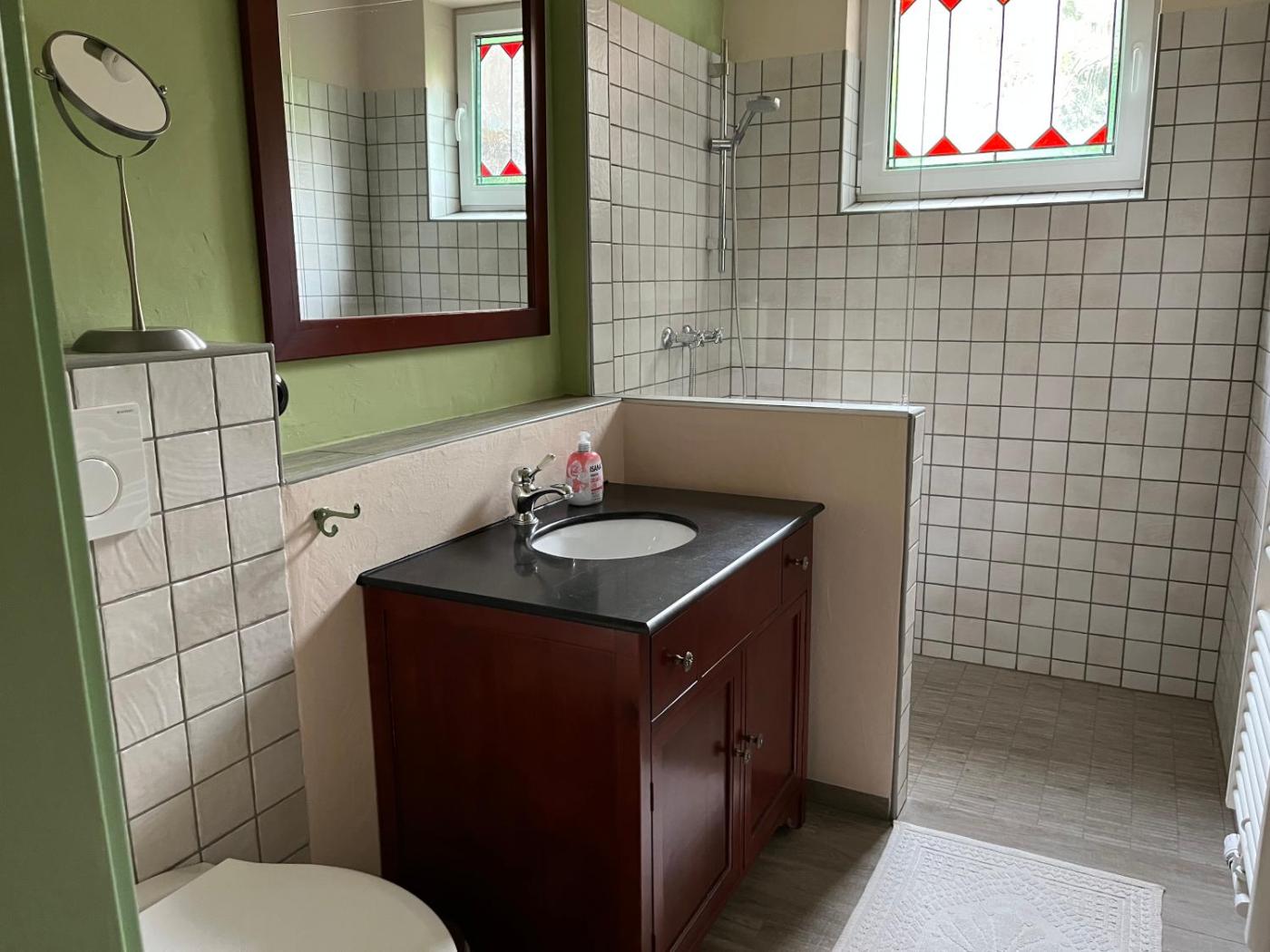 Apartment mit 1 Schlafzimmer und Garten. Featuring a private entrance, this spacious apartment also consists of 1 separate bedroom, 1 bathroom with a shower, a kitchen and a dining area. Meals can be prepared in the kitchen, which is equipped with a stovetop, a refrigerator, an oven and a microwave. The apartment features parquet floors, a seating area with a flat-screen TV, a tea and coffee maker, a wardrobe as well as garden views. The unit offers 1 bed. ;